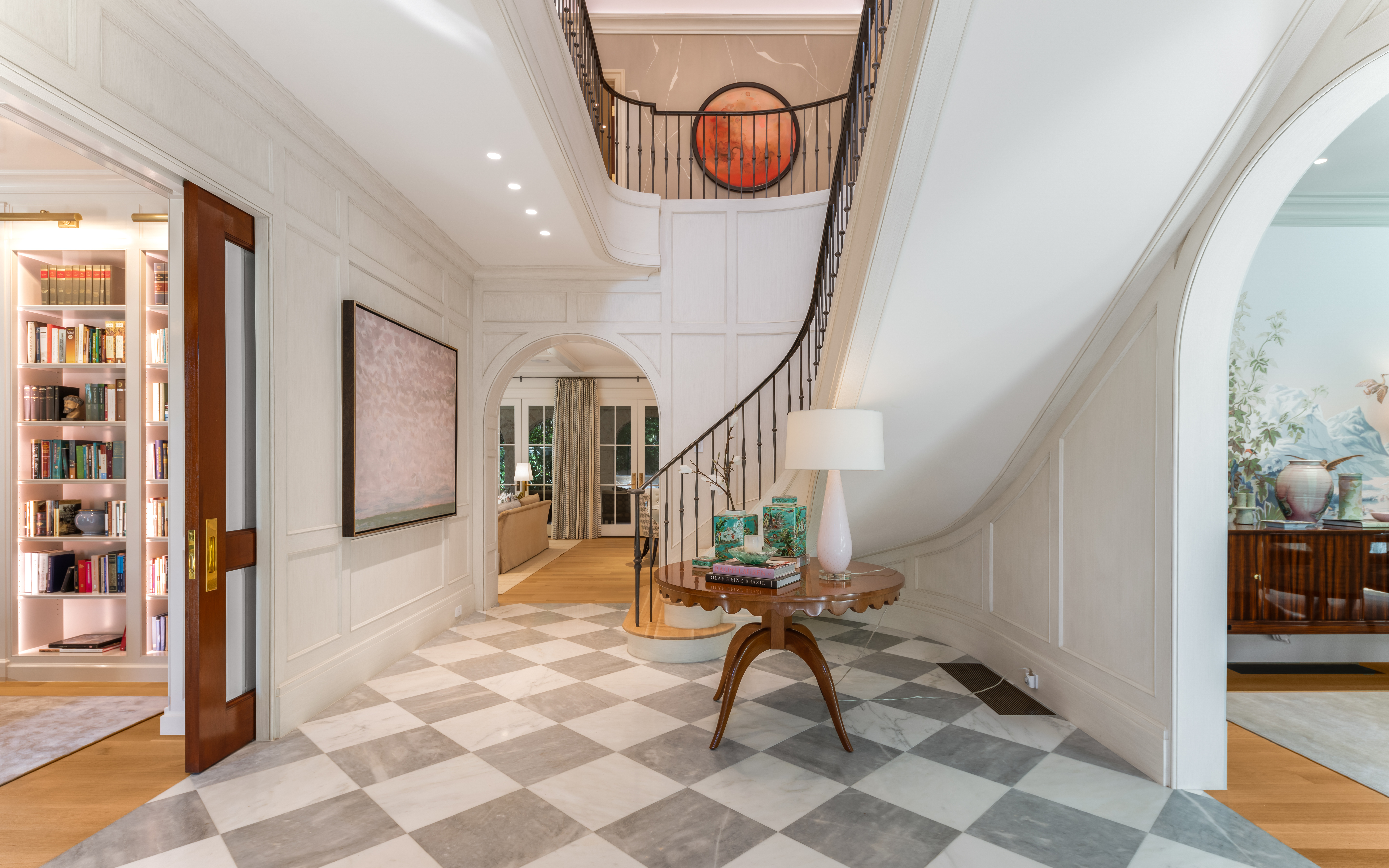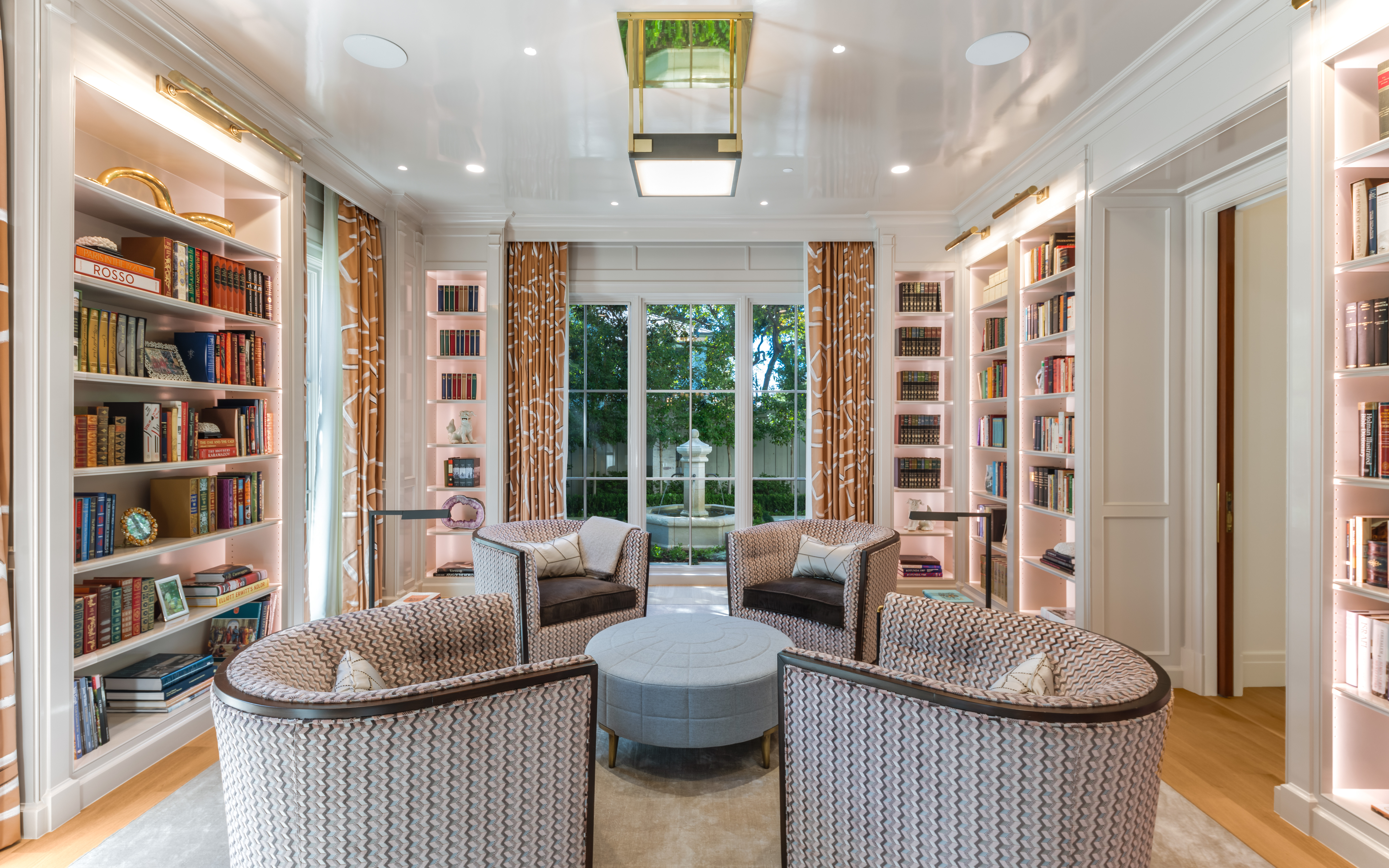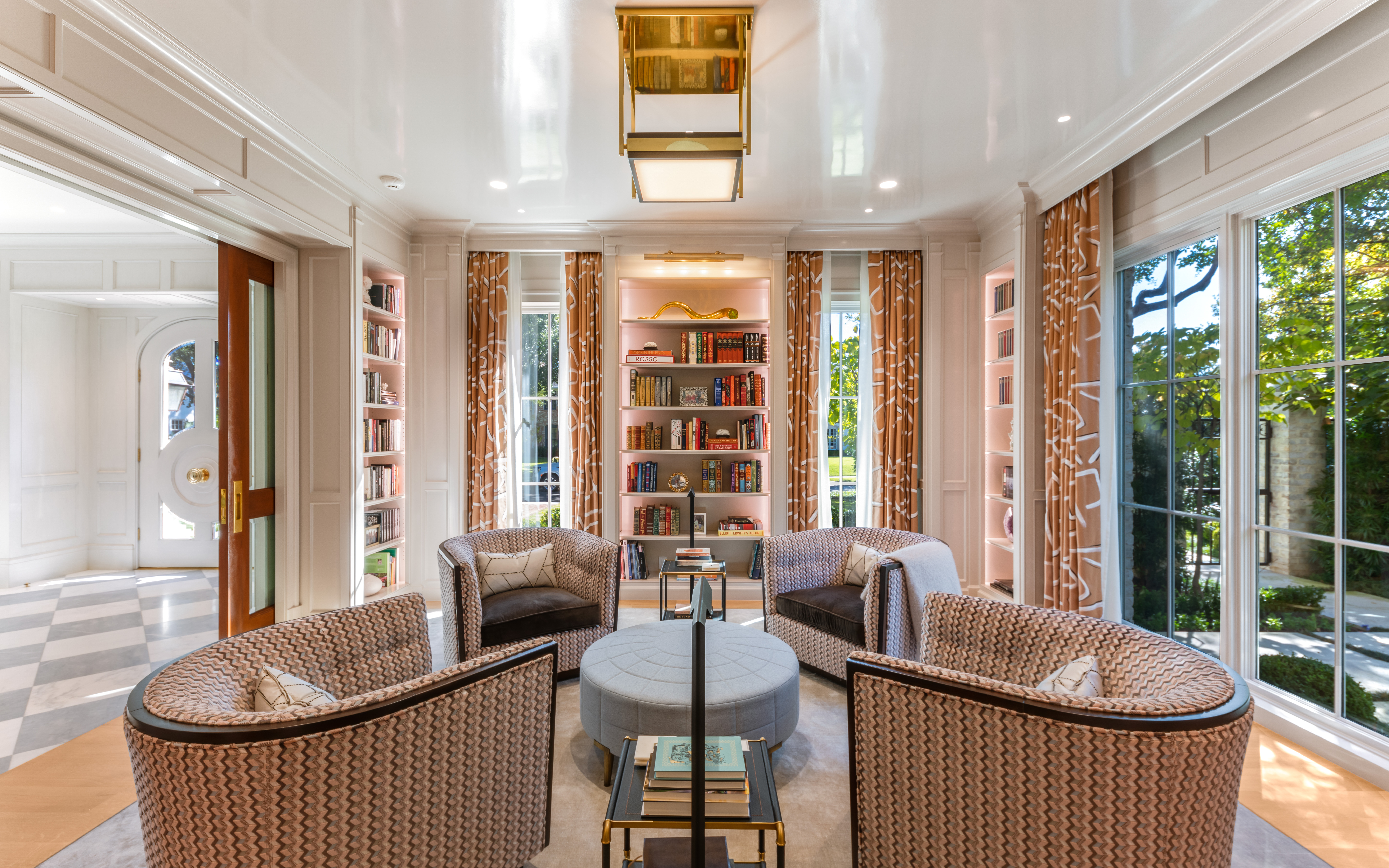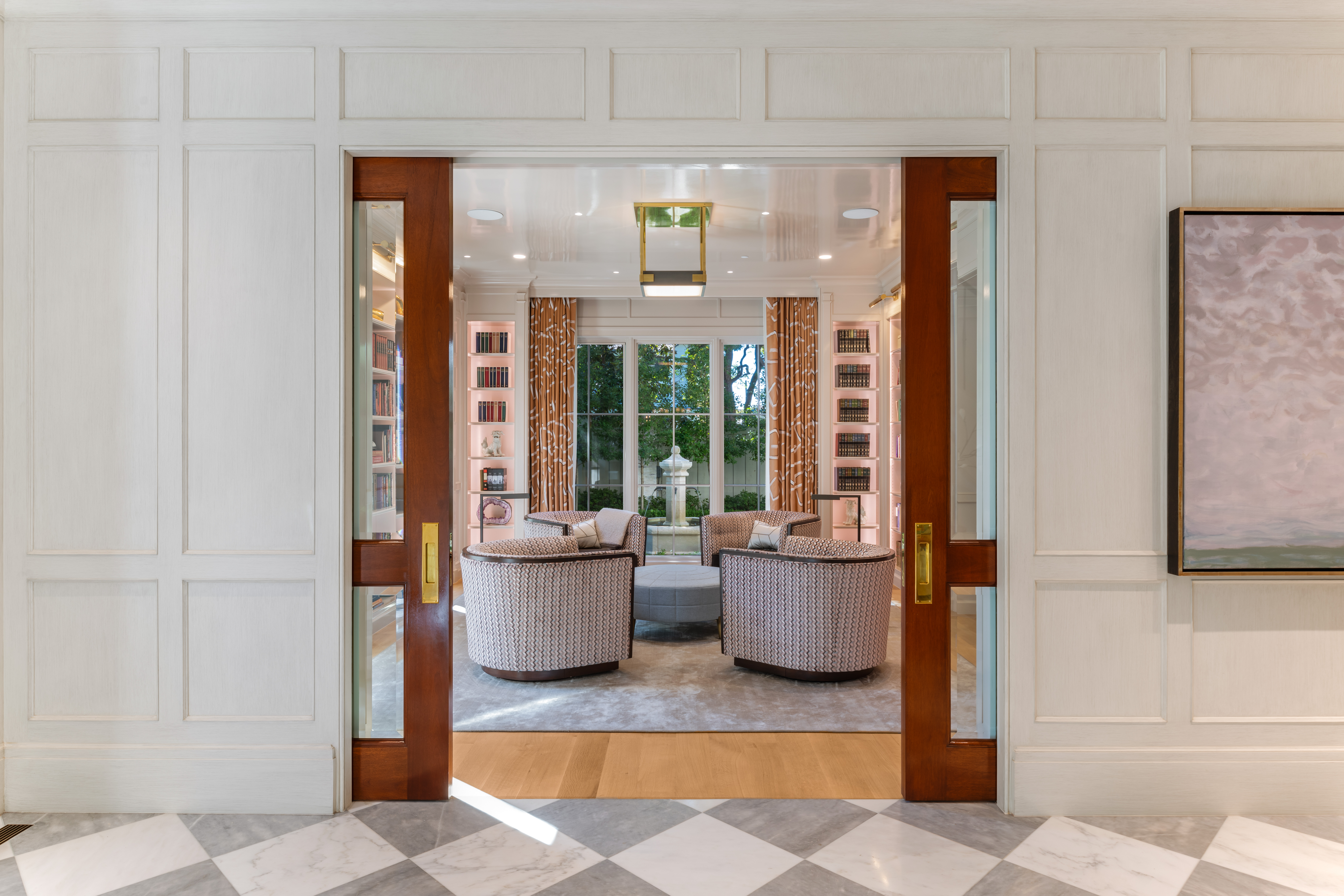 To the left, mahogany pocket doors reveal a private library crowned by a lacquered ceiling. Custom moulding wraps built-in bookcases, while a semi-flush square fixture adds a hint of modernity—embodying the thoughtful lighting design that brings edge to every room.