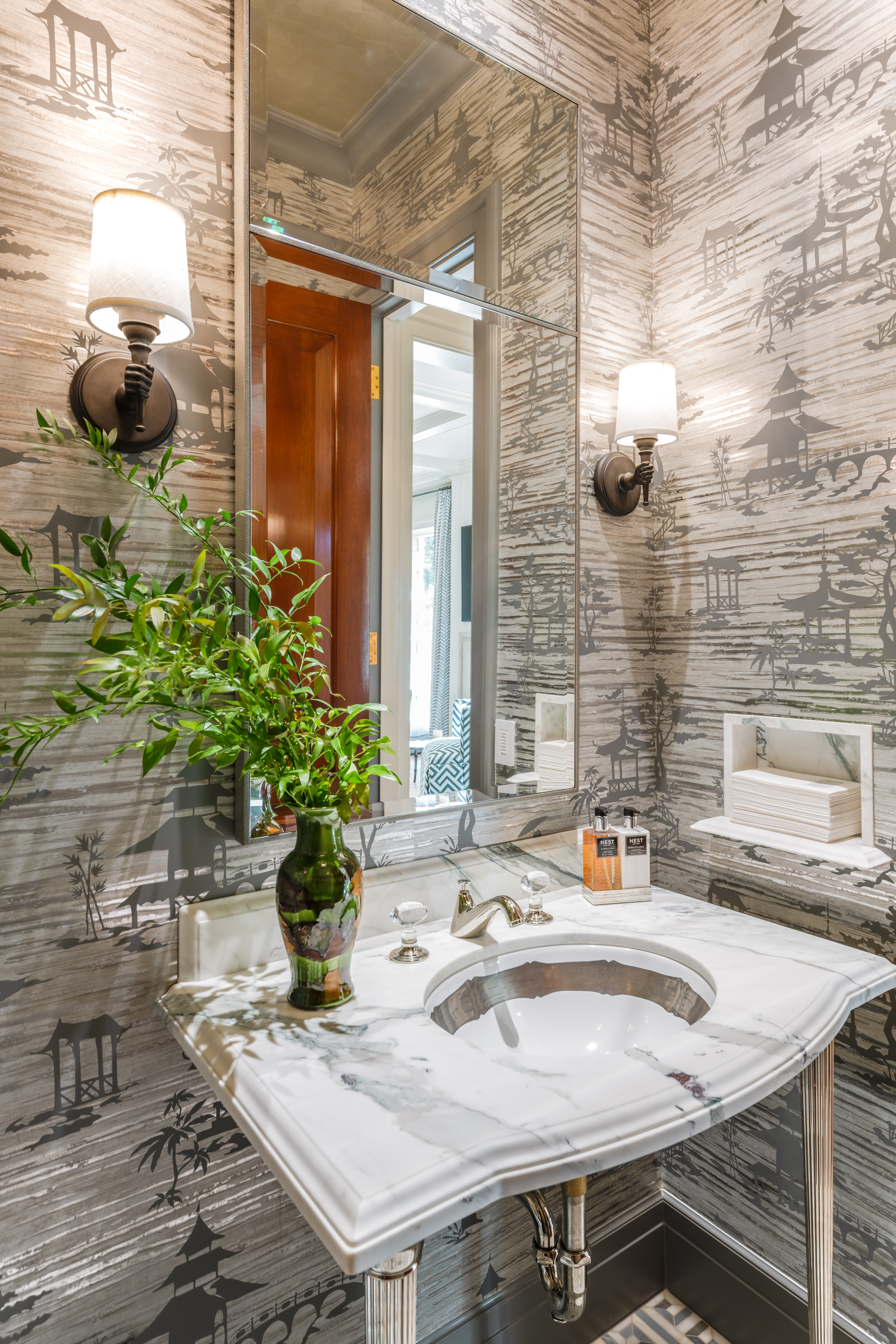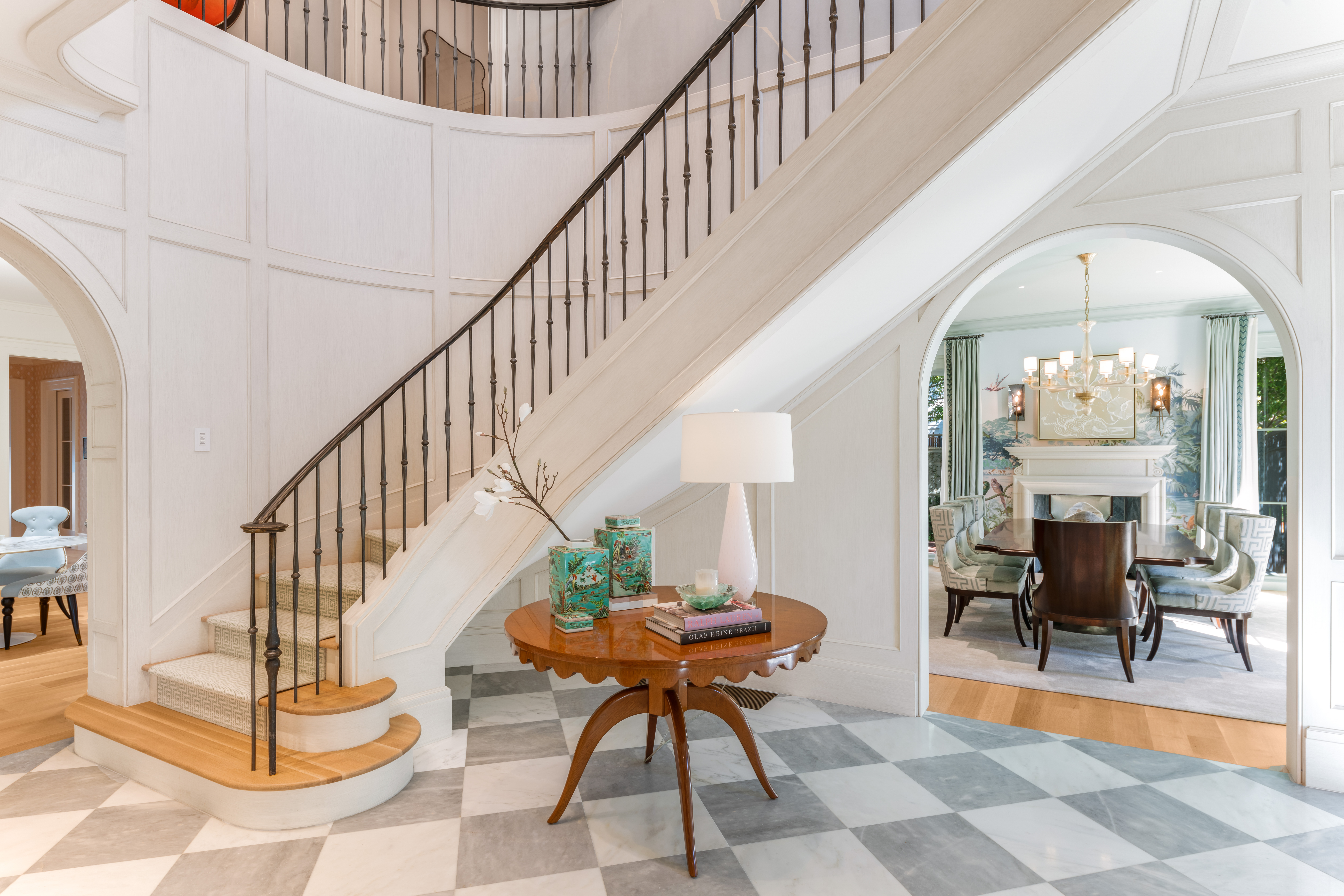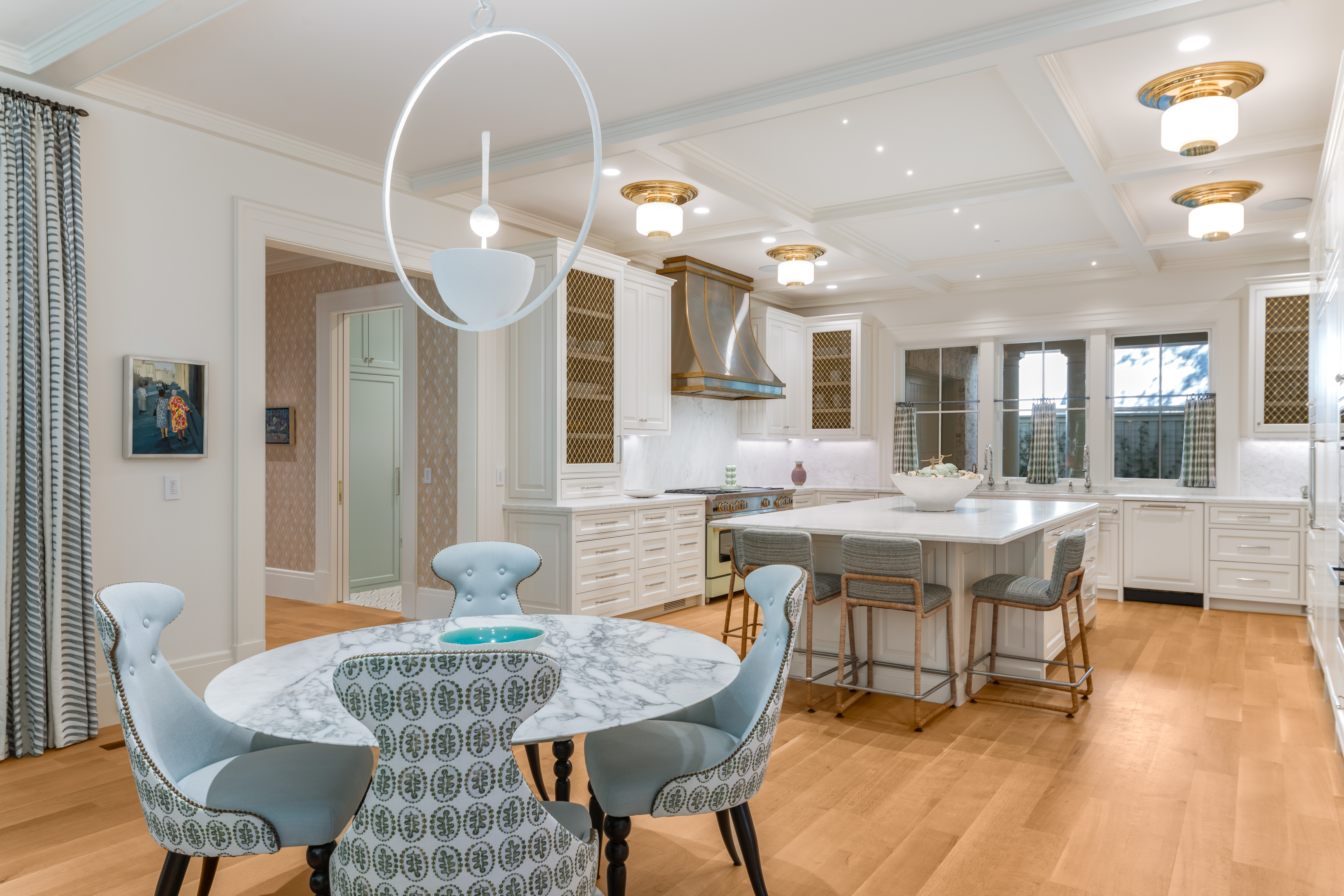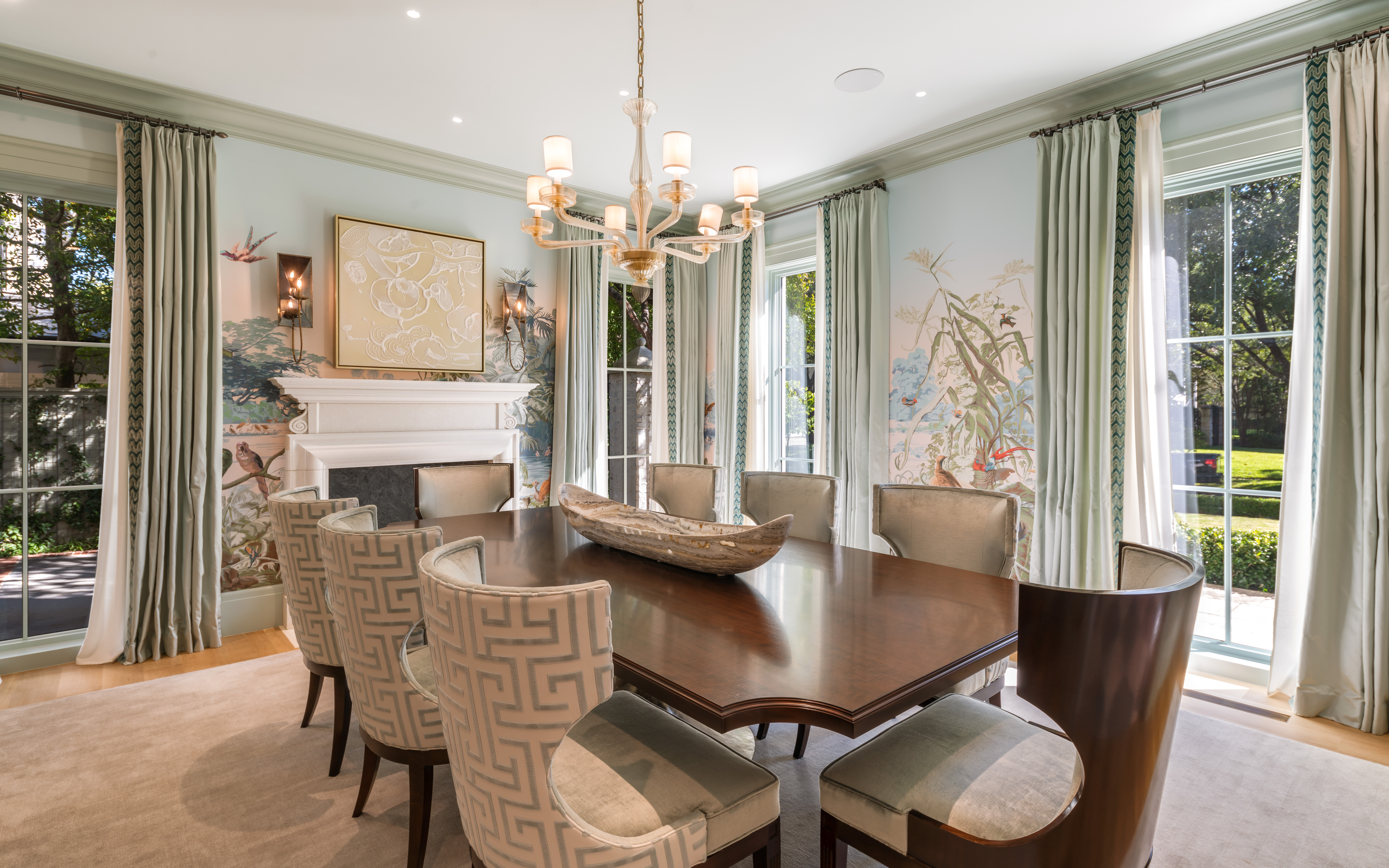 The formal dining room marries old-world charm with contemporary elegance. Wrapped in Zuber's Le Brésil wallpaper inspired by Haviland porcelain, a Jan Showers Collection chandelier cascades overhead, casting soft light where pattern and color, tradition and the unexpected achieve perfect balance.