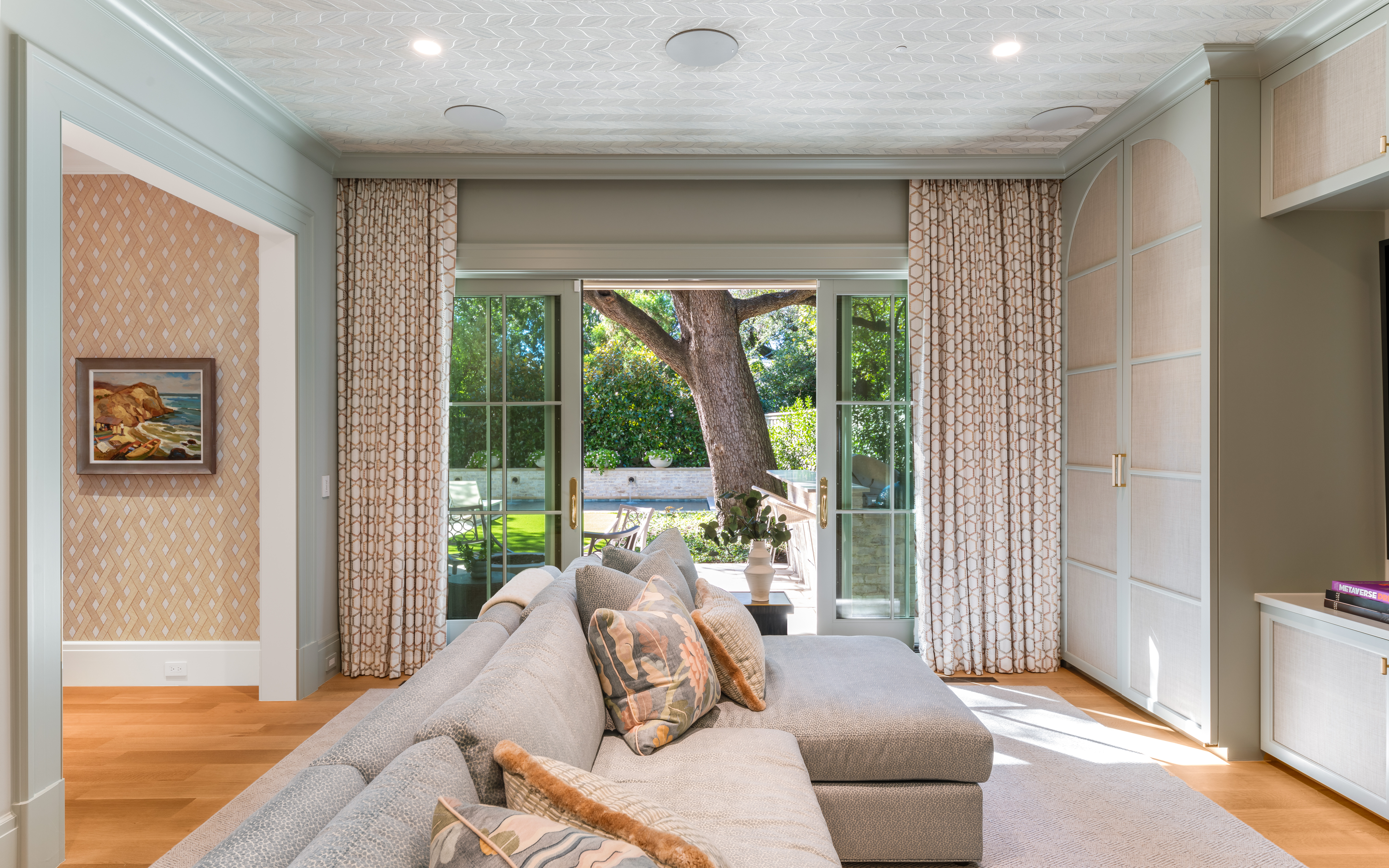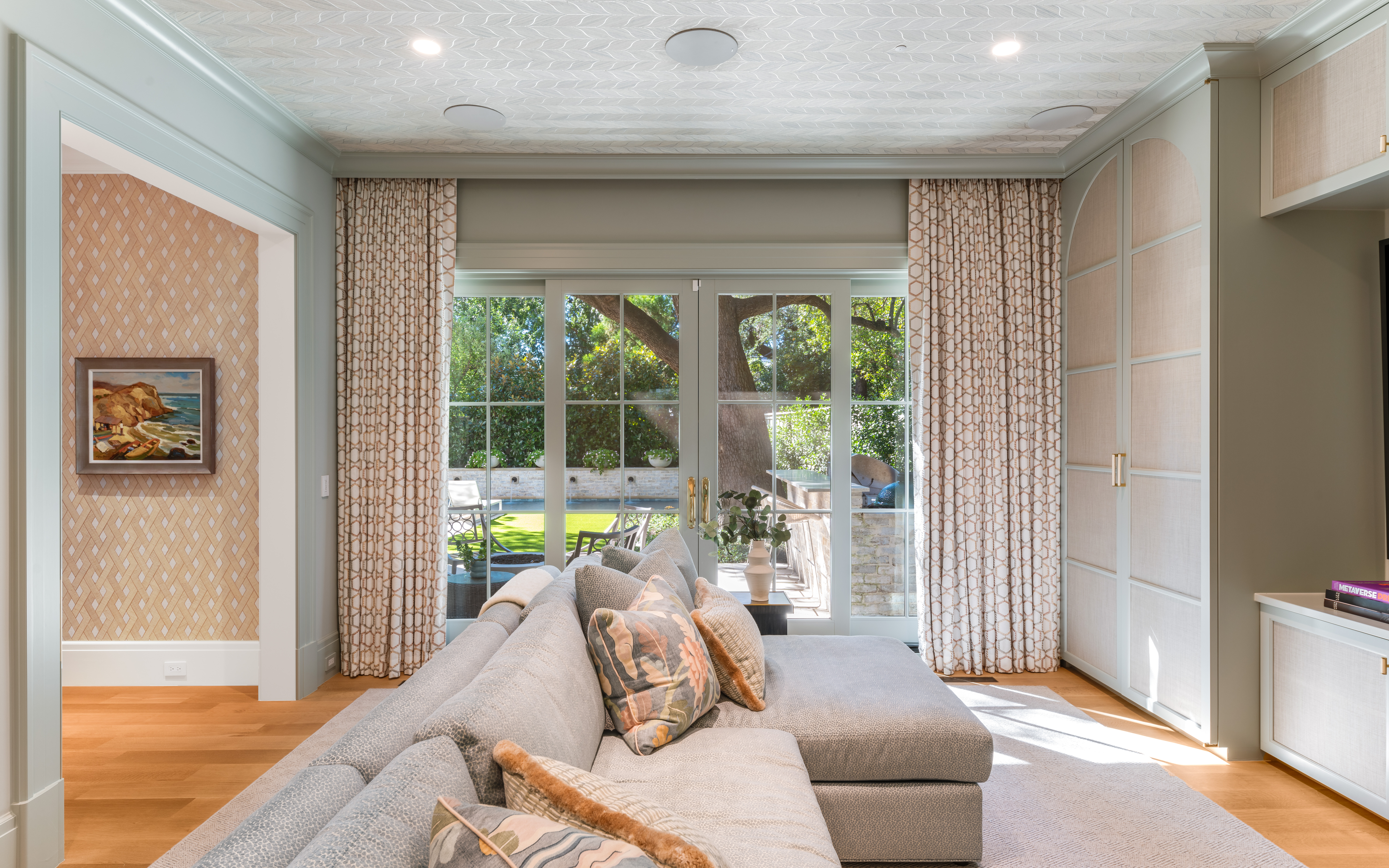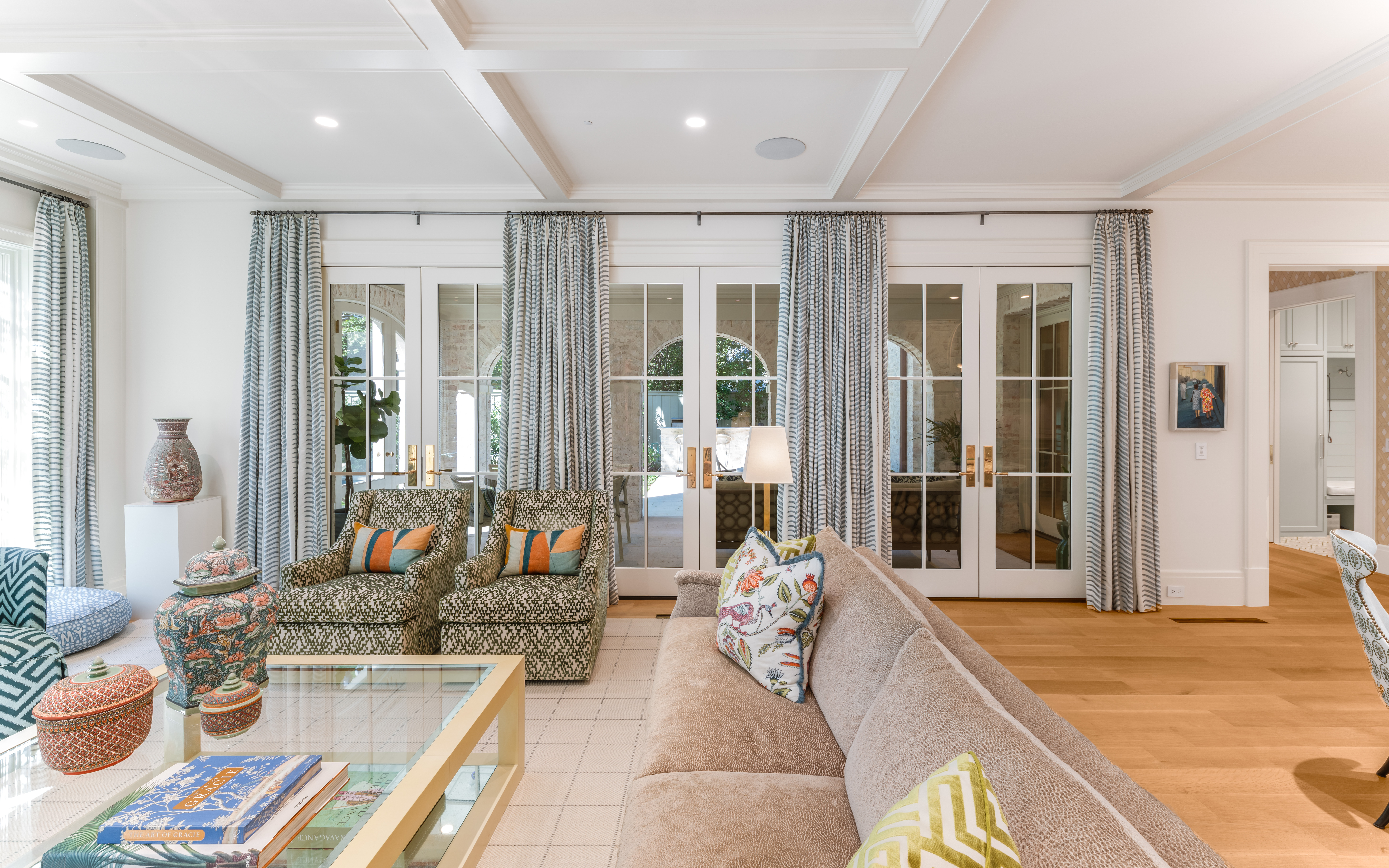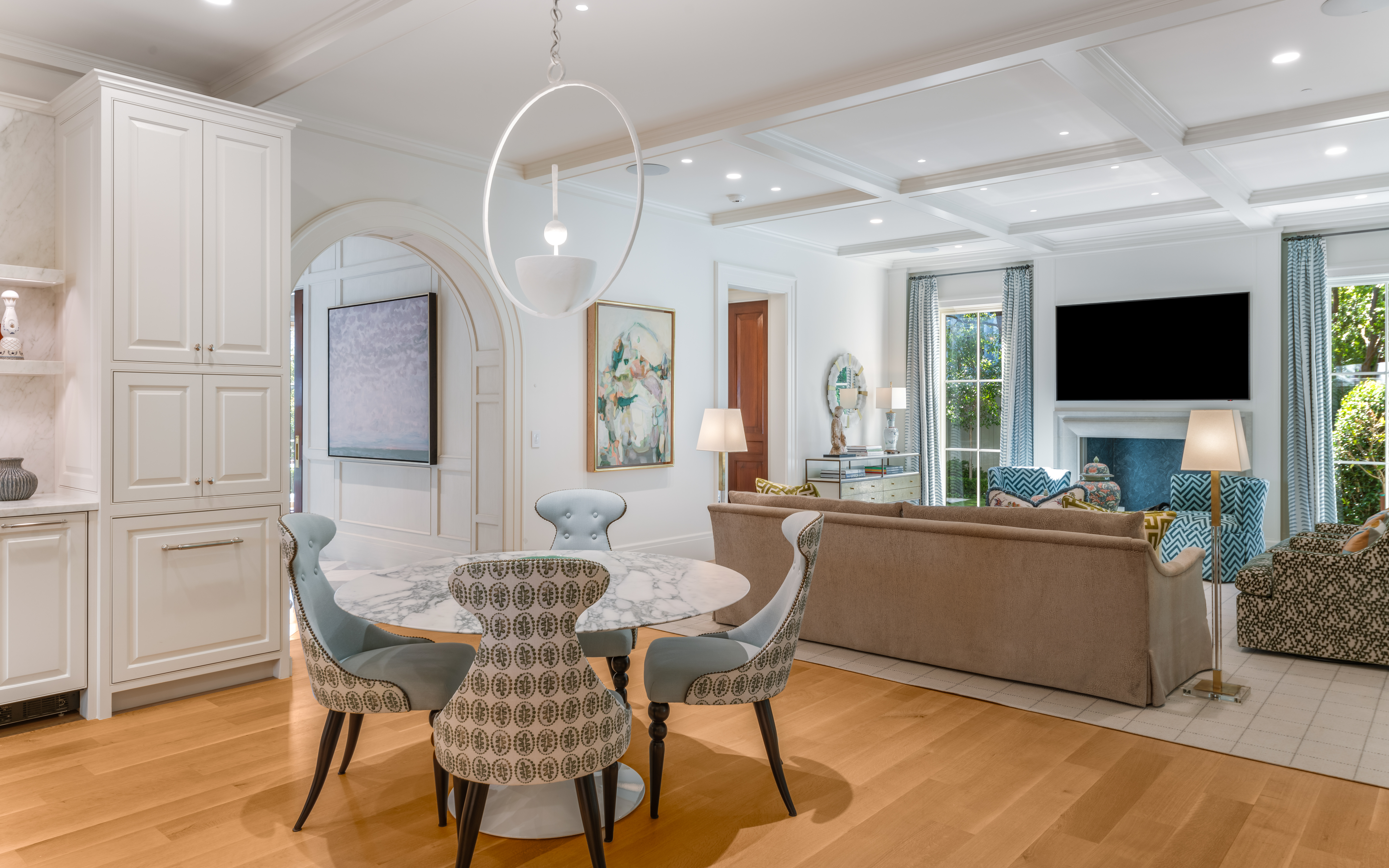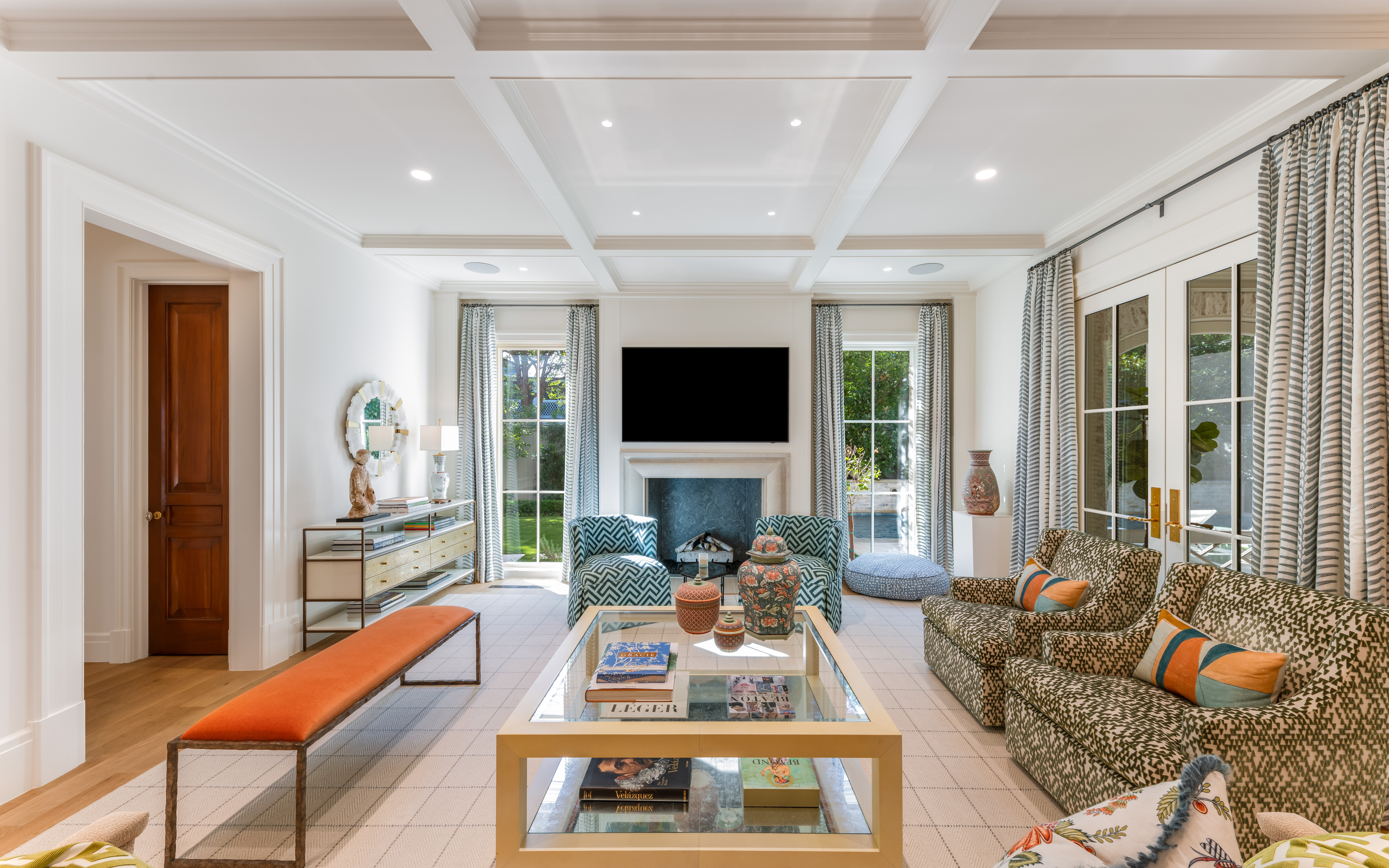 The family room centers on one of three fireplaces, where graceful detailing creates a space for quiet reflection and lively conversation—a room that breathes elegance with every curated touch.