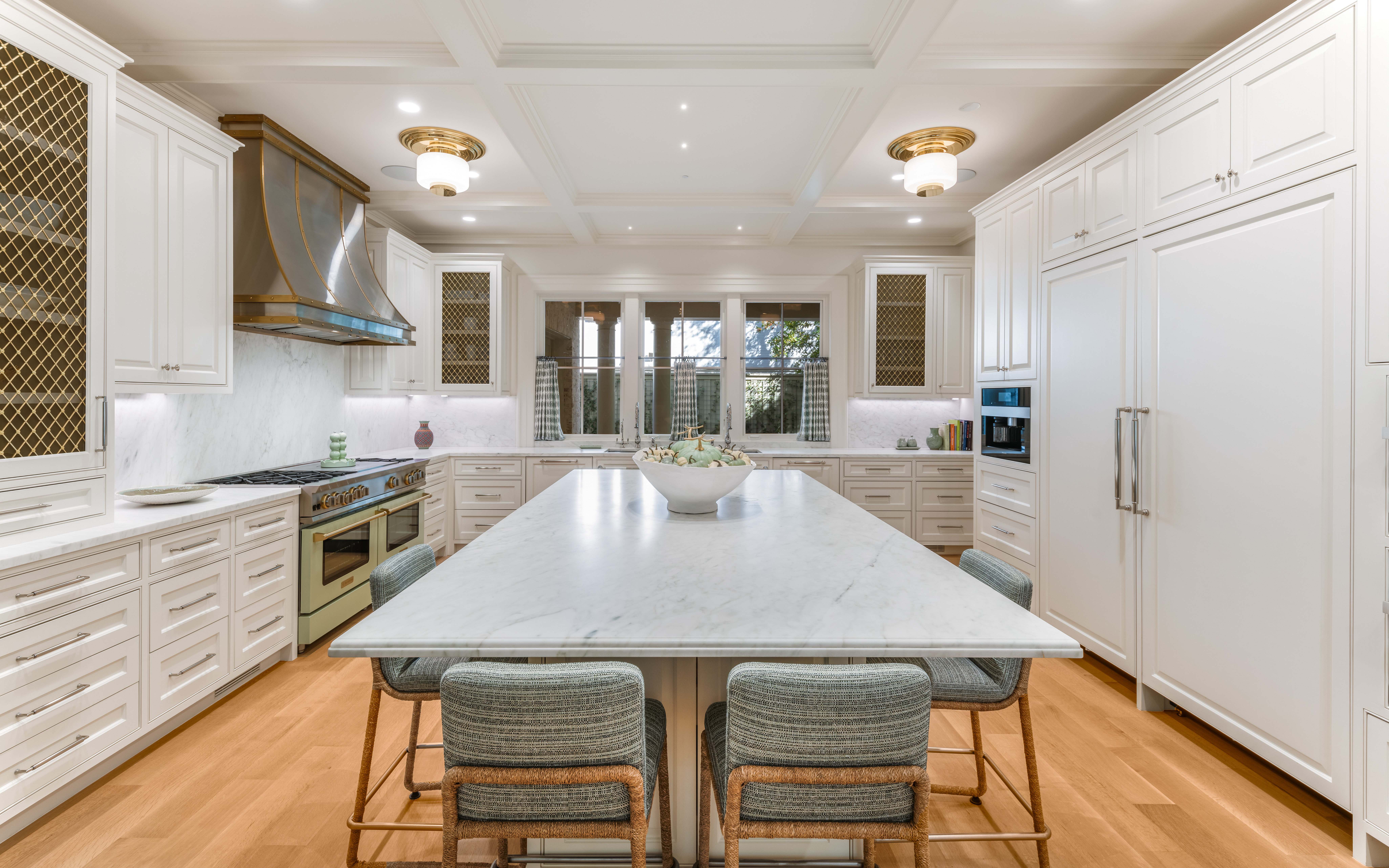 The kitchen makes a statement in both form and function. Custom cabinetry in a satin finish frames the culinary heart of the home. A chic vent hood adorns the professional-grade Blue Star commercial range, while a Calacatta-topped island anchors the space. The customizable galley sink, double ovens, dual dishwashers, Miele appliances, built-in coffee bar, and wet bar with ice maker ensure precision and ease. A spacious butler's pantry with refrigerated drawers provides seamless service.