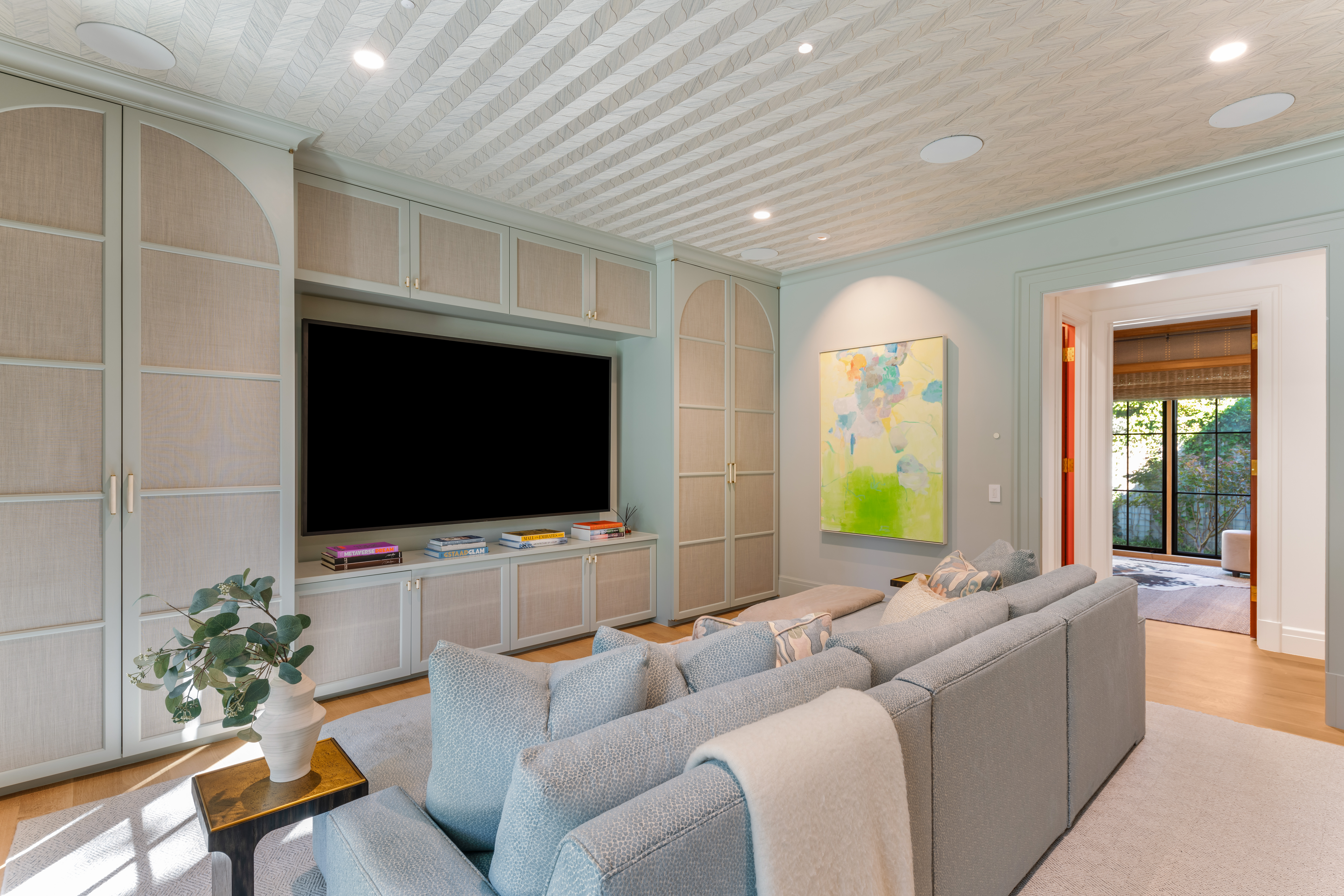 The media room is a technological marvel with French doors opening to the backyard, blurring indoor luxury with outdoor tranquility. Nearby, one of two home offices includes an ensuite bathroom for convenient use as a downstairs bedroom suite. An elevator, full-home generator, and Crestron smart-home system with automated shades are just some of the amenities.