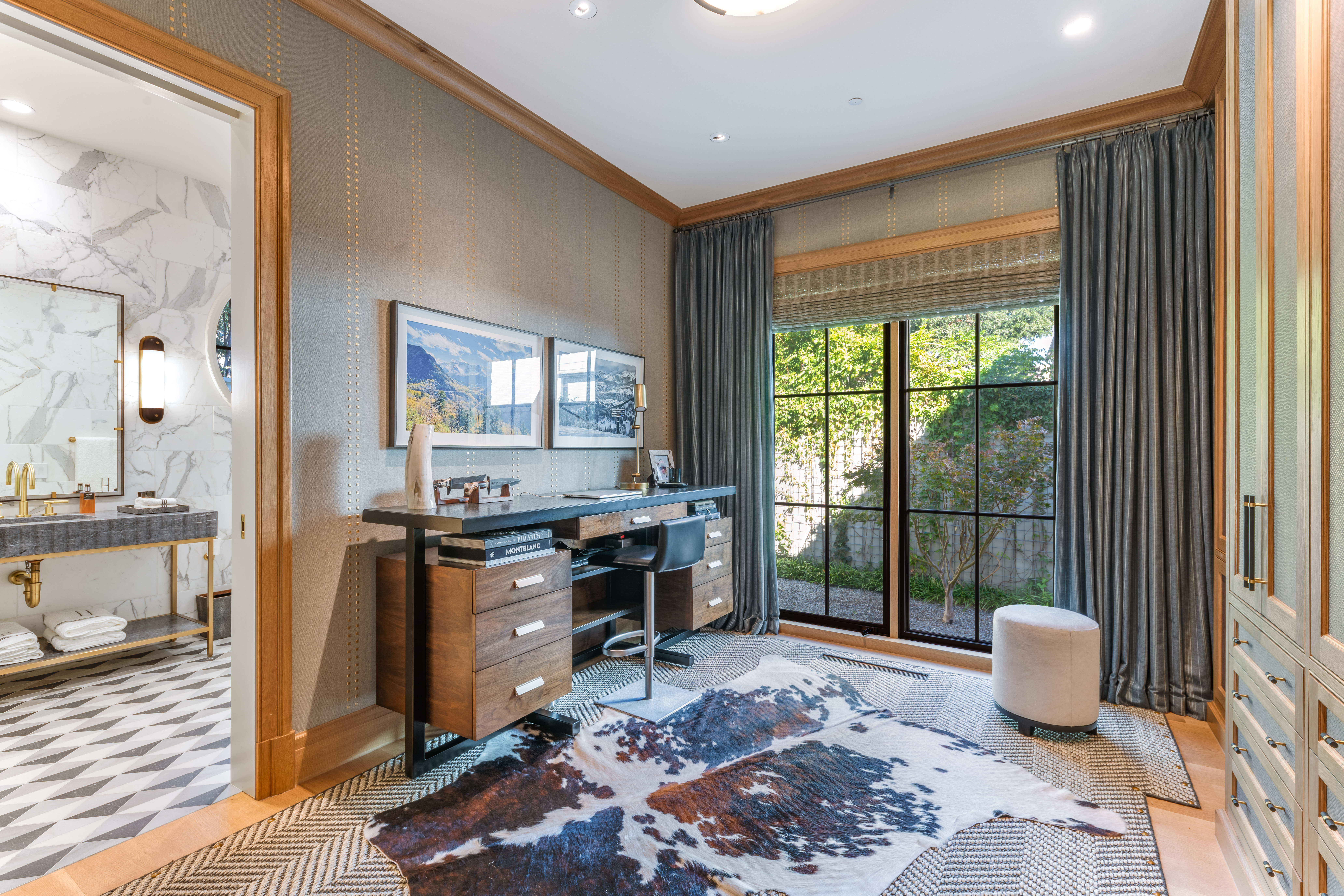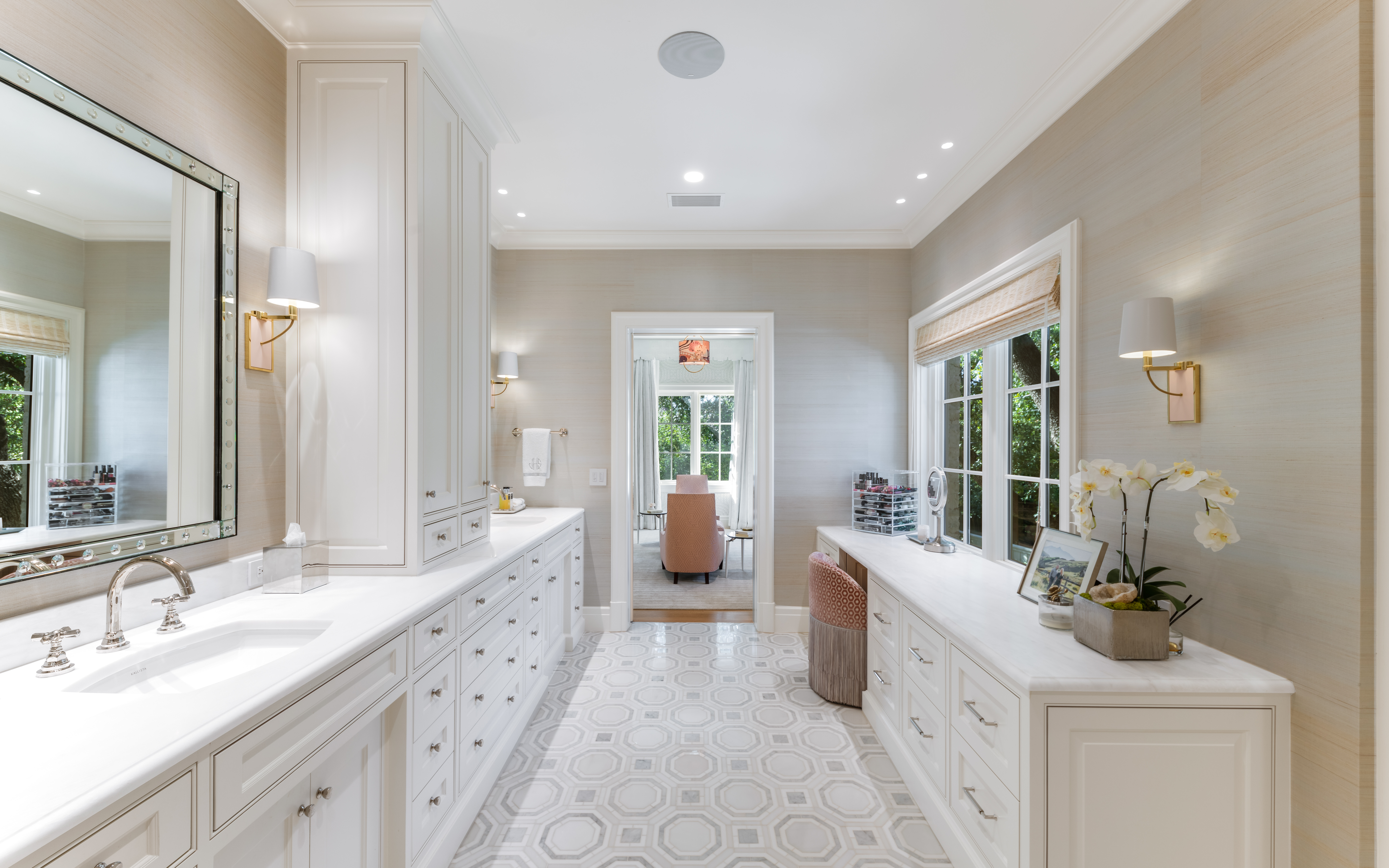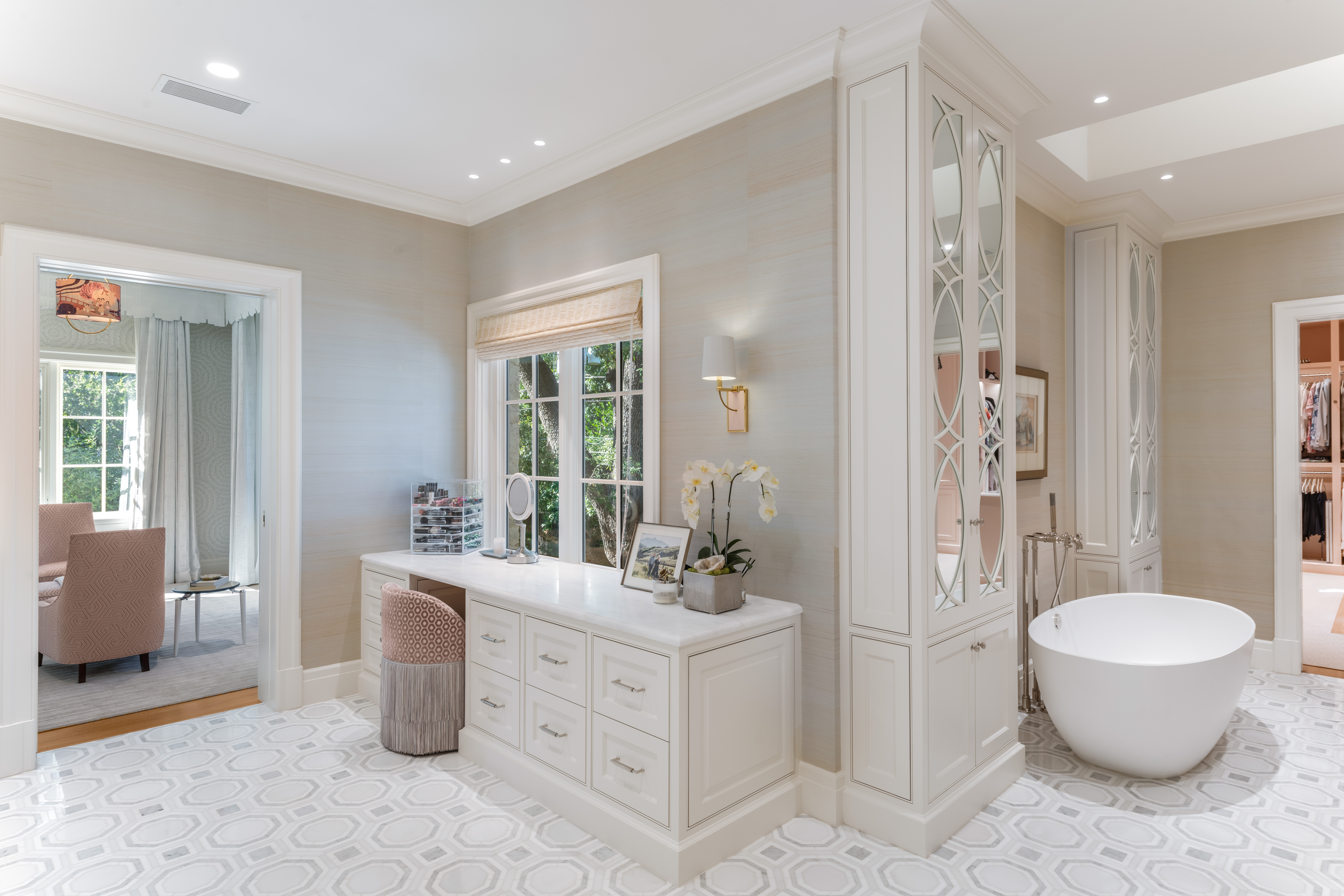 The primary suite is a private retreat where serenity reigns. Thibaut wallpaper cocoons the room, while a fireplace, built-in bookshelves, and sitting area create intimate corners for rest and reflection. The ensuite bath showcases geometric marble motifs across the floor, while a beautiful soaking tub and a custom floral-tile walk-in shower offers a daily escape. Dual closets with extensive built-ins provide exceptional storage, one of which opens directly to an upstairs utility room with abundant cabinetry and a large storage closet—thoughtfully designed for convenience and function.