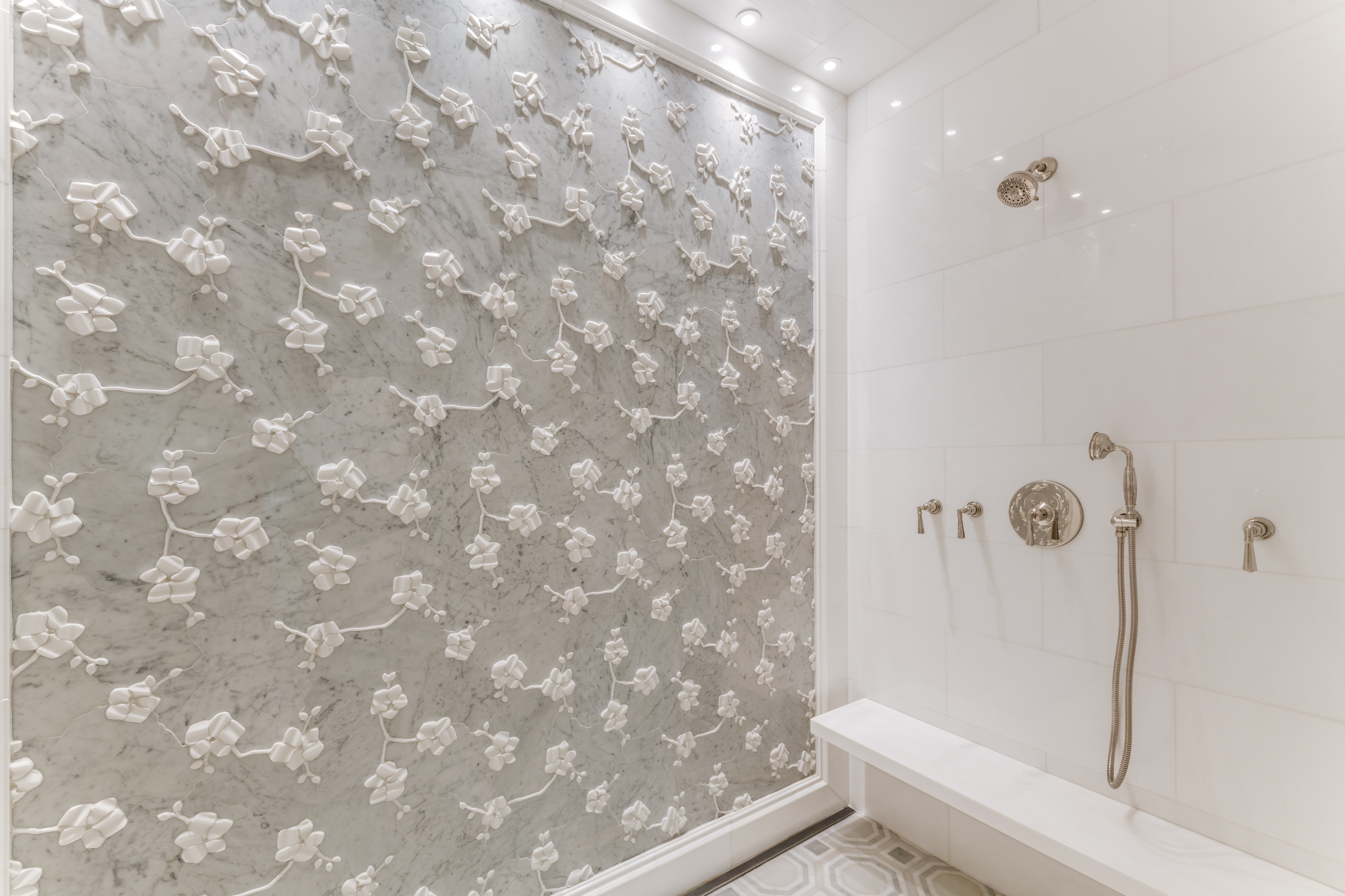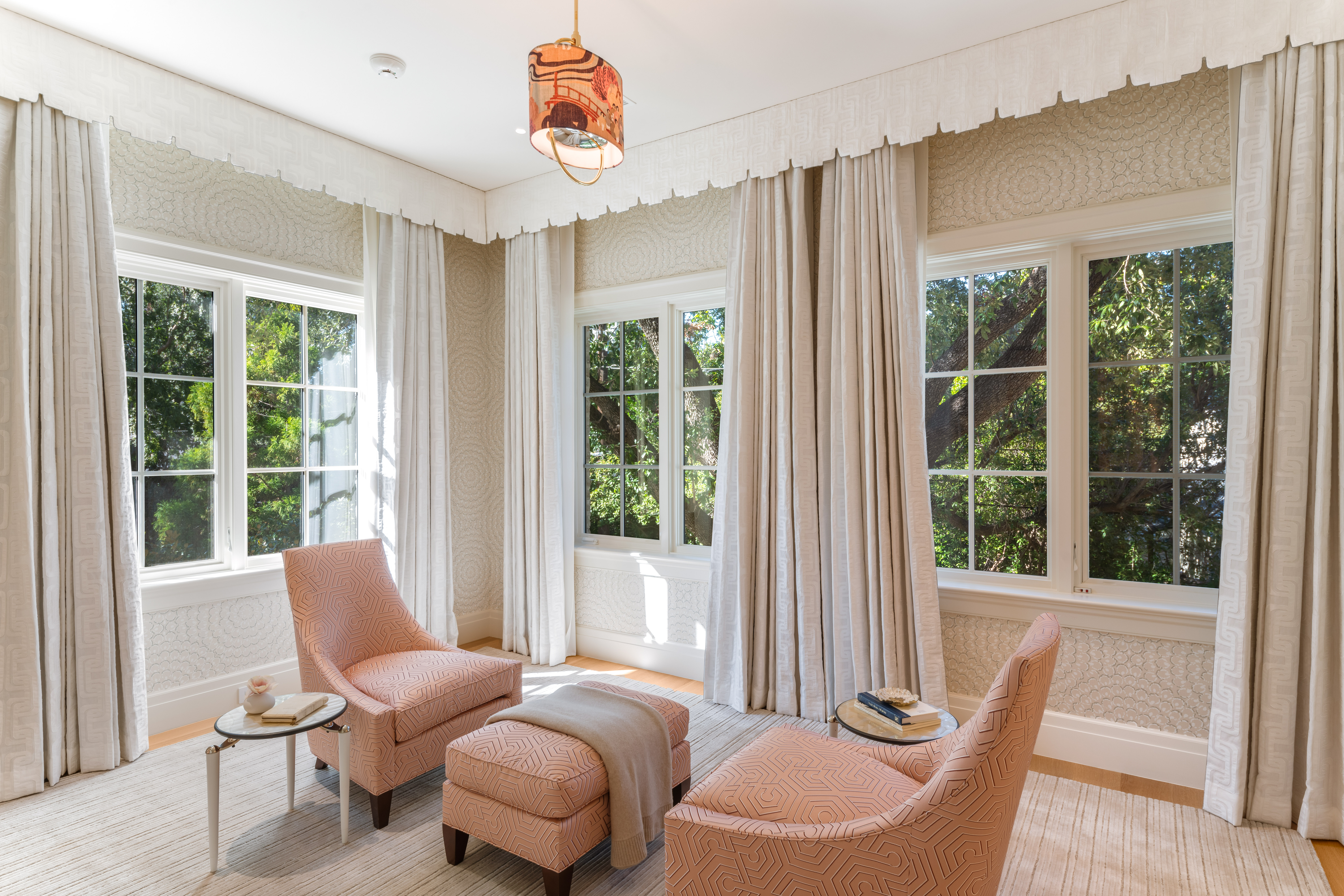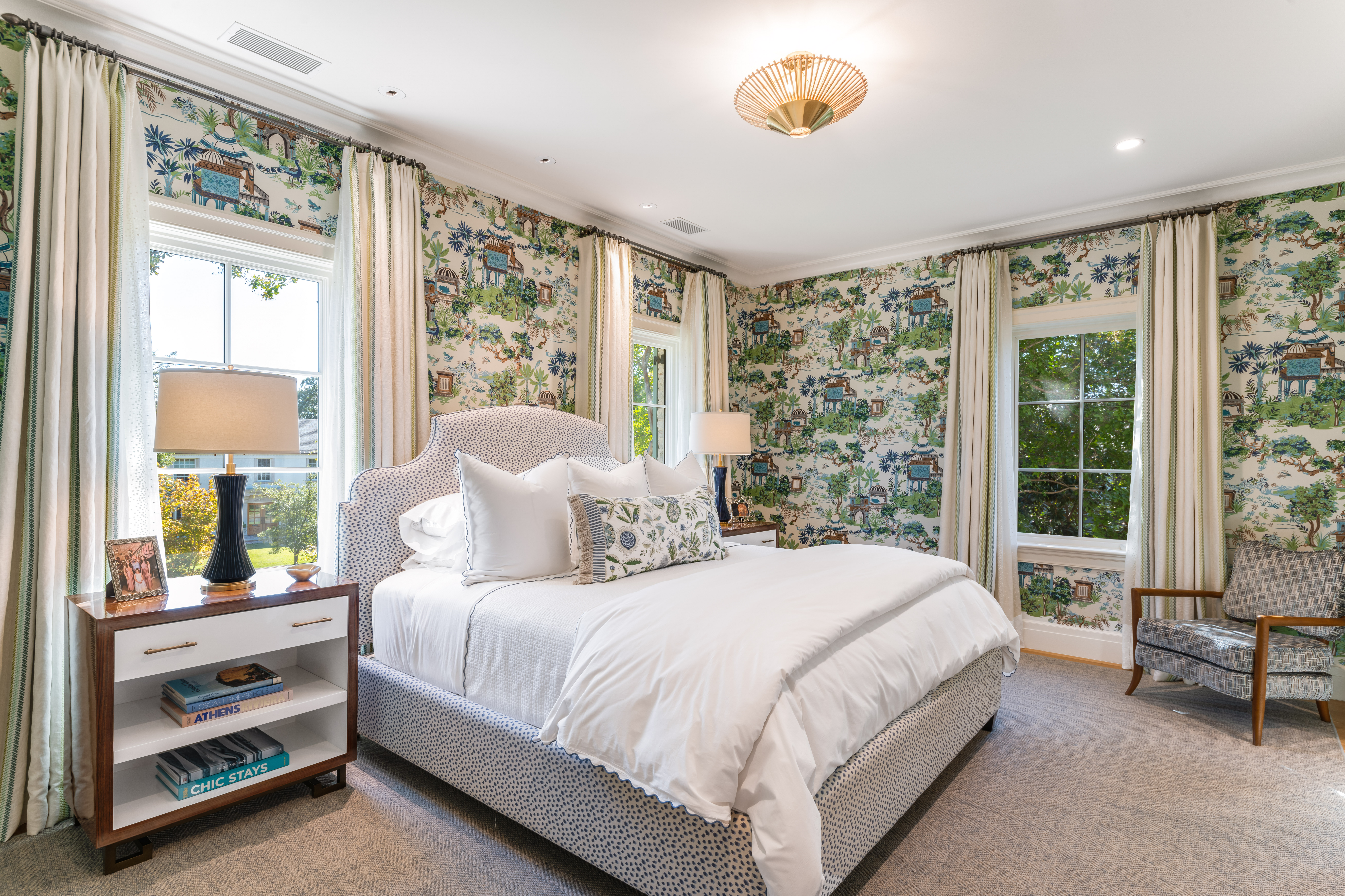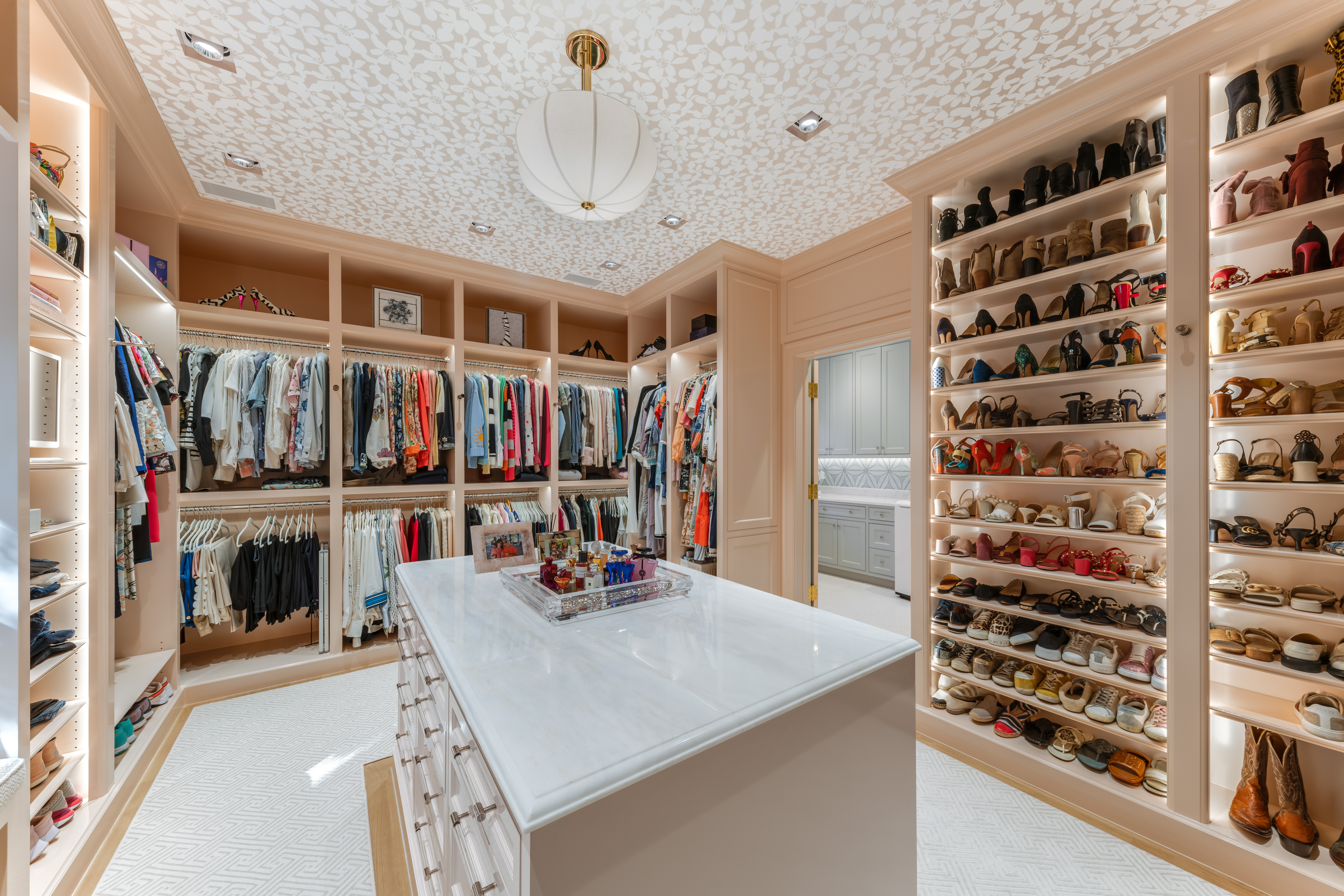 The primary suite is a private retreat where serenity reigns. Thibaut wallpaper cocoons the room, while a fireplace, built-in bookshelves, and sitting area create intimate corners for rest and reflection. The ensuite bath showcases geometric marble motifs across the floor, while a beautiful soaking tub and a custom floral-tile walk-in shower offers a daily escape. Dual closets with extensive built-ins provide exceptional storage, one of which opens directly to an upstairs utility room with abundant cabinetry and a large storage closet—thoughtfully designed for convenience and function.