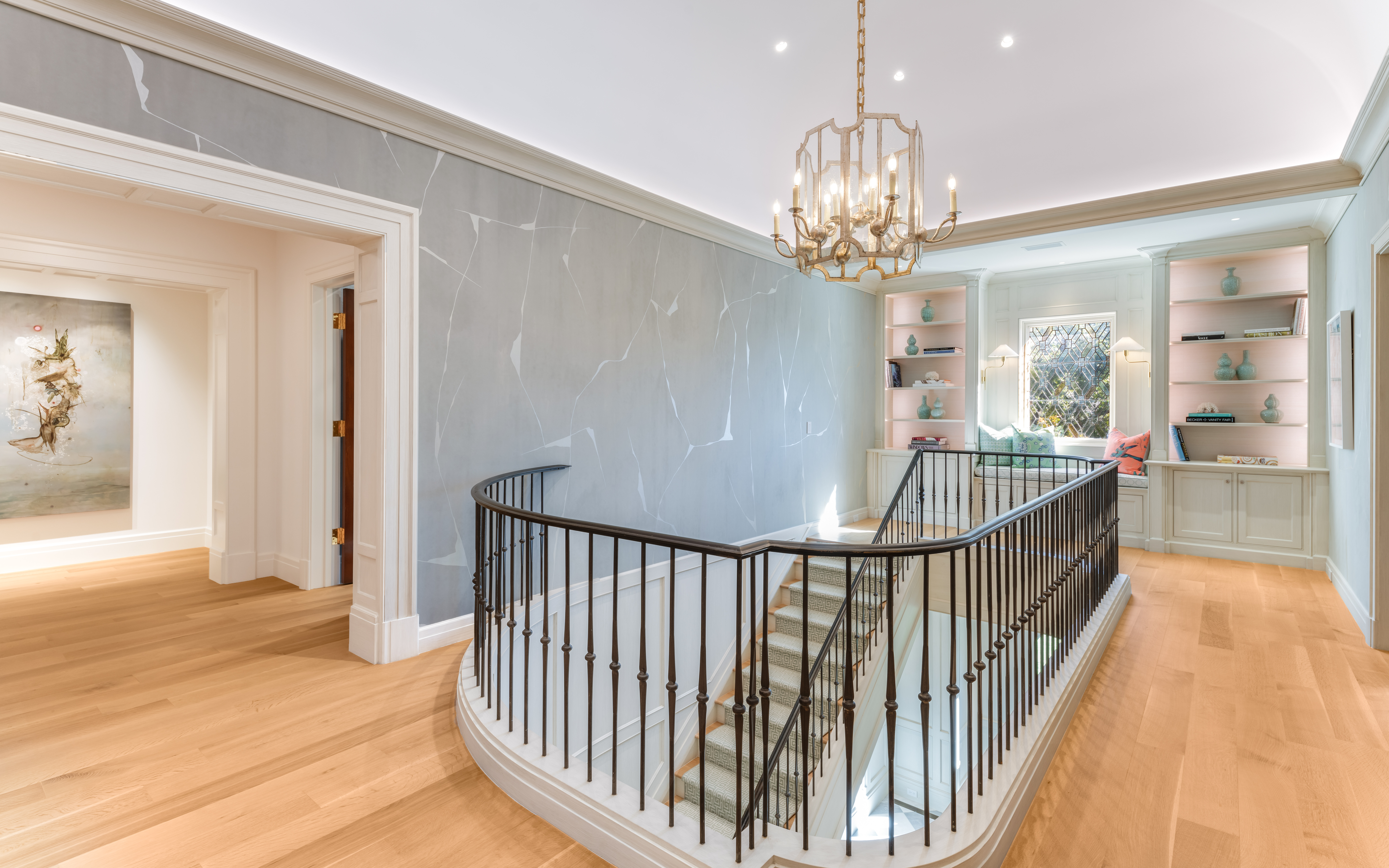 Upstairs, the striated-paint technique guides your eye to the upper landing, where a custom stained-glass window bathes the space in light. A built-in bench with storage offers a moment to admire the artistry.