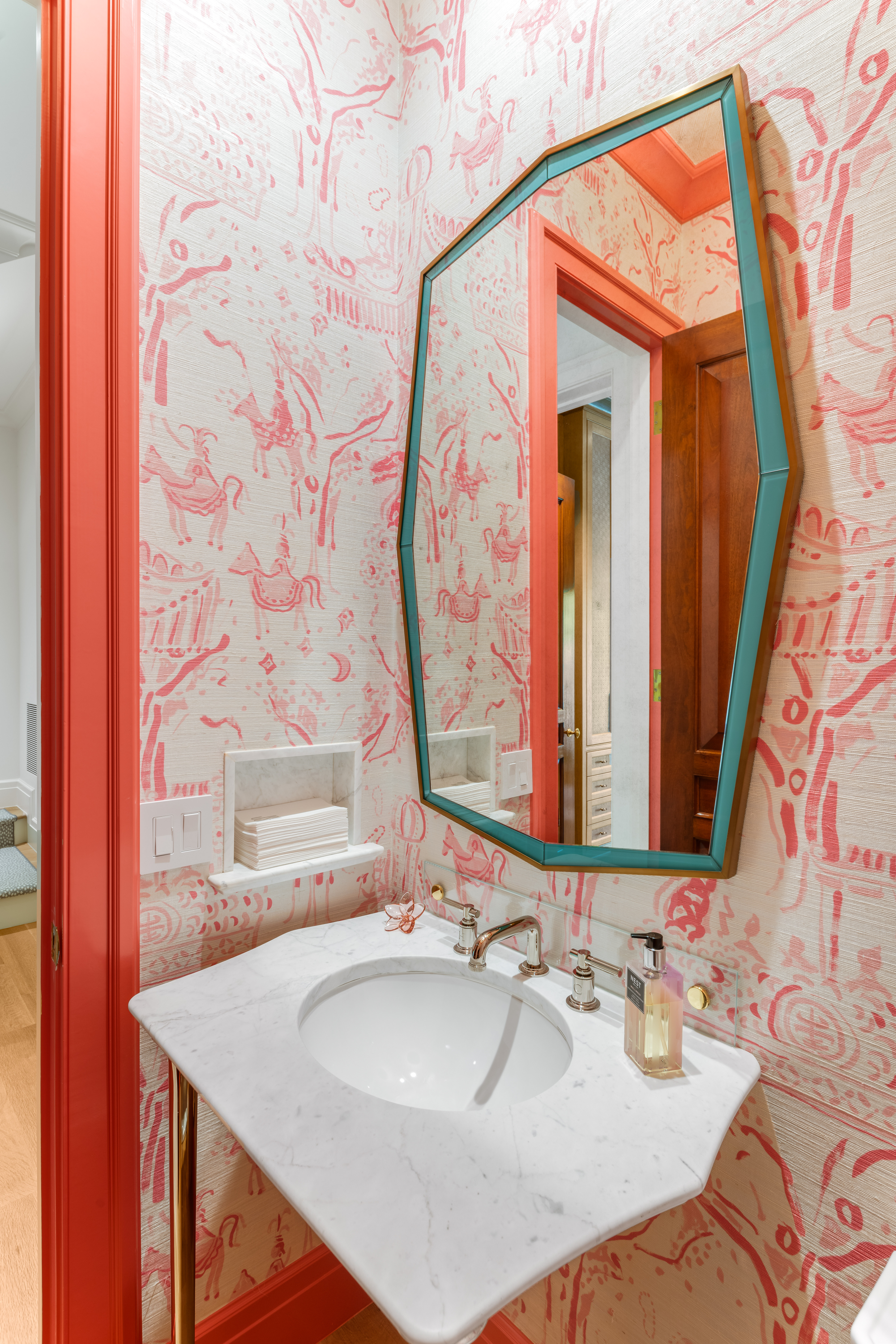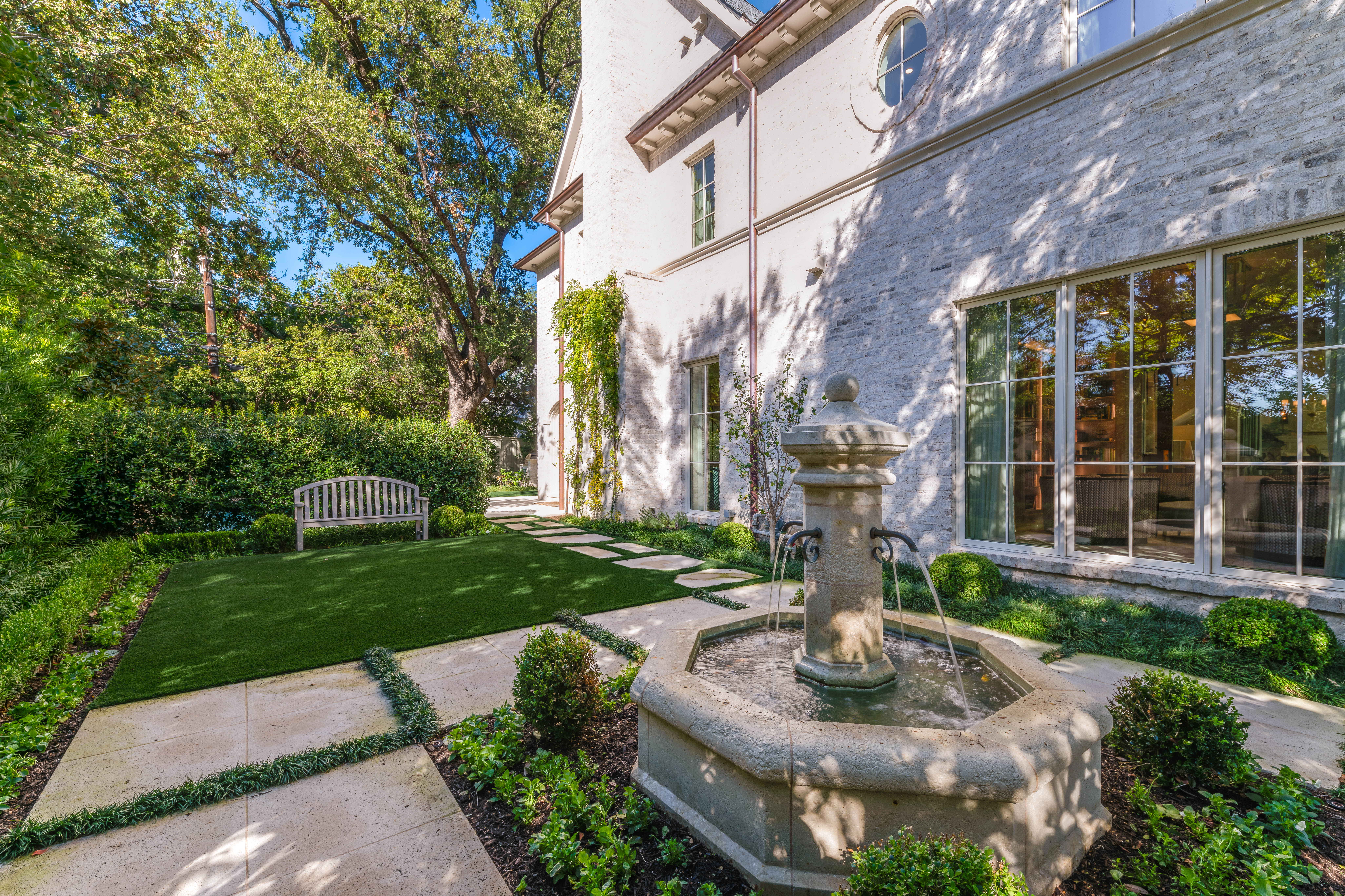 Set on a .314-acre lot, the creamy brick facade with sculpted cast stone accents draws the eye to the entrance, where limestone steps guide you to the front door. Inside, the foyer introduces a striated Farrow & Ball paint treatment that flows up the staircase, accentuating the home's architectural bones. Custom doors, millwork, and mouldings unite light-filled interiors with a bold yet elevated use of color threading throughout.